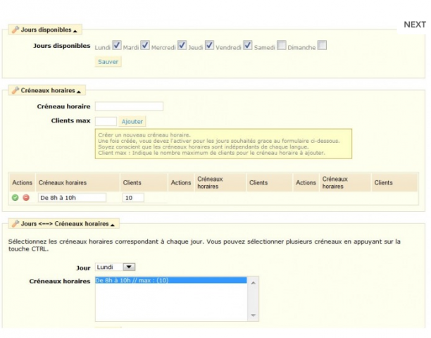 - Pour chaque jour de la semaine, possibilité d’affecter des créneaux horaires différents