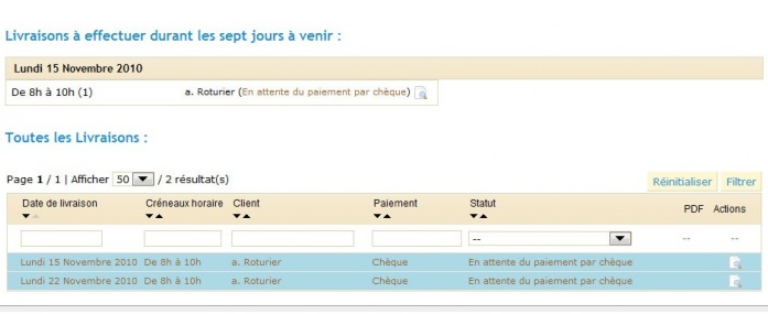 - Création d’un onglet affichant les livraisons à effectuer, affichage en deux parties :